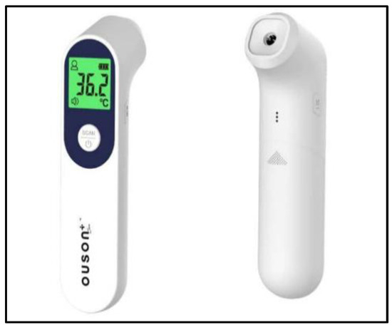 For sensor performance assessment, body temperature readings retrieved by the prototype system were compared to medical-grade standalone sensors—in this case, a non-contact thermometer, as shown in Figure 10, for the evaluation of device accuracy and reliability. It should be noted that values retrieved by the prototype system are defined as test readings, while base readings are the values obtained by the standalone thermometer. A total of five body temperature readings were recorded over the course of five days from 10 test subjects, by recording one reading every day for a grand total of 50 readings, as tabulated in Table 1.