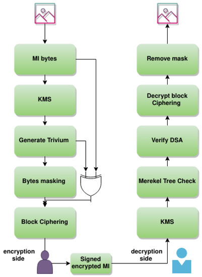 This paper has proposed, developed, and investigated a new encryption algorithm for medical images, MID-Crypt. MID-Crypt provides three security services for medical images: confidentiality, integrity, and authenticity. Confidentiality is achieved through the steps shown in Figure 1: image bytes masking and block ciphering. Integrity is achieved through the Merkel tree algorithm, which ensures that the image content was not changed either by a malicious third party or accidentally via noisy transmission channels. While DSA is used to provide authenticity means, only users who have permission to view the image’s content will be able to view and access the image. The DSA algorithm aims to confirm patients’ IDs as well. We have provided mathematical and visual evidence to guarantee security and privacy issues. Initially, MID-Crypt generates a Trivium cipher for image masking by applying an XOR operation between the image and the Trivium cipher. After that, the masked image ID is digitally signed by the DSA algorithm. Merkel tree checks and the DSA process are added to guarantee integrity and authenticity. Moreover, the PSNR of values can be considered sufficient to destroy the visual characteristics of encrypted images. As for the correlation factor between the original and encrypted image, the correlation between the two images is low, indicating high distortion of the encrypted image. Finally, the entropy analysis provides an excellent value approaching the eight. The efficiency measurements performed in this study have shown high protection and security standards, considering the algorithm’s simplicity and time efficiency. Therefore, MID-Crypt can be adopted as a good candidate to be deployed through the healthcare applications to provide security solutions in a comparable processing time. In the future, we will consider the use of multi-authentication factors to provide further security levels to private data. Also, we will seek to maintain multi-layer protection for the medical image data to improve the overall system confidentiality. Moreover, we will also attempt to adopt AI-driven techniques to automate the protection process and provide a more autonomous nature in the key management and distribution stages.