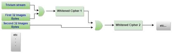 The encryption keys of EKM were used to generate a trivium cipher, as Trivium was used to create a random key-stream consisting of 32 bytes. Then the image bytes were masked using the xor process; the xor process was applied between the first 32 bytes of the image and the generated trivium cipher, the result of the xor process was then XORed with the next 32 bytes of the image, and so on until the xor passed all over the image. Figure 6 illustrates the masking process. MI masking here can be described as a diffusion process applied on the image where any minor change in the Trivium cipher would be reflected as a notable change in the result. On the other hand, bit-wise xor operation between the image and the Trivium cipher provides high means of efficiency in the case of hardware platform [5]. Image masking can be considered a first layer encryption operation followed by a block ciphering step, which produces the same bytes quantity as in the same image. Figure 7a represents the original image, and Figure 7b illustrates the output of the image masking process.