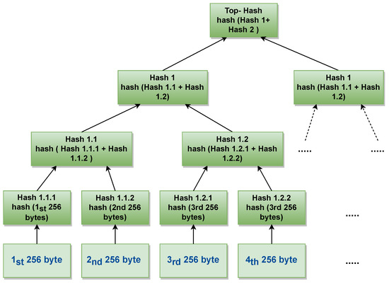 Checksum data integrity used in proposed work based on Merkel tree hashes. Merkel Tree is considered a tree of hashes, where the leaf nodes are the hashes of the data blocks. Merkle tree was used to preserve the image integrity, where the receiver can ensure that the image has not been corrupt or damaged. Each leaf contains the hash of a data block with 256 bytes from the original image. The hash function used in the Merkle tree was SHA256. Figure 8 illustrates the Merkel tree hash performed on the image. The resulted Merkel tree has 17 levels according to the following formula: