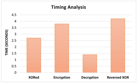 The fourth Measurement is Time Analysis. The time execution is detailed for image 1 in Table 1, with 4288 × 2816 pixels. Figure 12 illustrates the time execution for each step in the proposed model. The execution time for XORing the image with Trivium was 2.702 s, whereas the time execution for encrypting the resultant XORed image was 3.337 s. The decryption process took only 1.419 s. It can be noticed the reversed xor and reconstructing the image took the longest time, which is 4.152 s. The overall process took 11.61 s. The encryption time required to encrypt the images mentioned in Table 1 is listed in Table 5. According to the information listed in Table 1, the proposed algorithm can be considered a lightweight and practical algorithm that can be used with large high-resolution images without worrying about time.
