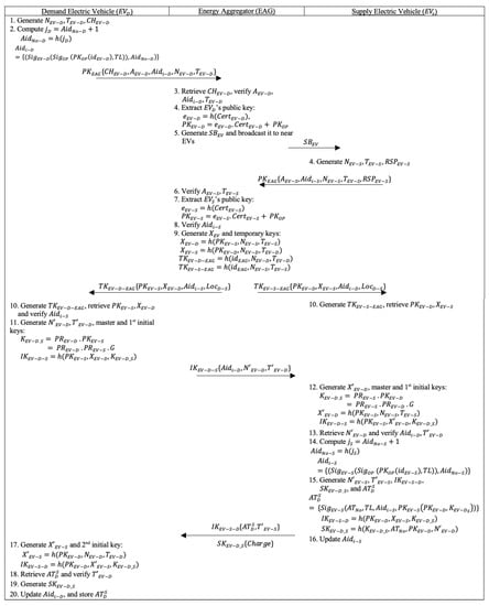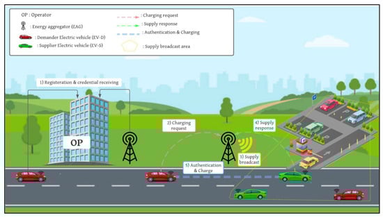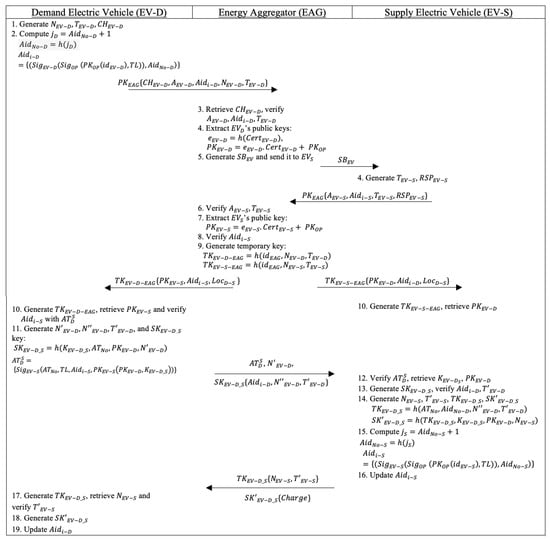To achieve a V2V energy transfer, the suppliers and receivers must first be matched. The best-fit EV supplier (to meet the charging needs of the demander EV) must be identified once the demander EV has made a request from within their neighborhood. This may be accomplished through centralized control and EV automation in order to interact and maintain their engagement through a local Energy AGgregator (EAG). During the search process, an EV seeking charging can request energy trading (amount and price) from its local EAG, which in turn chooses a supplier EV from a list of options and then matches it to the demander EV. EVs can pay for the service via the web app (perhaps with the help of third-party services such as banks or electricity companies). However, after the peers’ validation and matching by the EAG, the demander/supplier EV peers must physically meet in order to carry out the actual V2V energy transfer and link their batteries via a specifically designed DC–DC converter or through specified V2V-charging piles. Therefore, these EVs must mutually authenticate each other to ensure that no unauthorized demander/supplier EVs arrive and that the agreed-upon amount of energy can be transferred even though one of the EV’s owners is not onsite [].