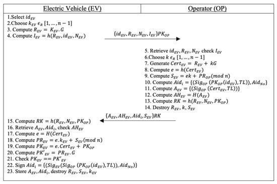When an entity (EV or EAG) wishes to use the charging system, they must first create their identities and public/private-key pair. Afterwards, from the OP, they obtain the relevant certificate, authenticator, private-key-construction data, and anonymous identity (for EV only).