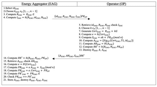 - OP: Any entity (EV or EAG) attempting to join the V2V-charging system must register its identifying information via the OP, which is the initializer of the proposed protocol. Since the OP acts as a certificate producer (trusted third party), authorized EVs can acquire access to other EVs’ energy-trading services and establish trust between them. Furthermore, the OP has the authority to reveal the identities of malicious or misbehaving entities.