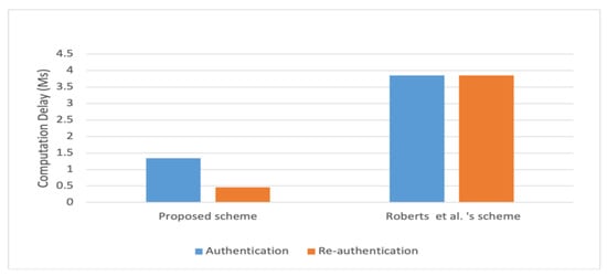 In Roberts et al.’s scheme [], the authentication phase of the EVs takes ms (). The proposed protocol requires ms (), and it provides better security and privacy preservation for the EV as well as a 65% improvement in computational cost. For the re-authentication process of the EV, the proposed protocol requires ms (), while Roberts et al.’s scheme [] requires ms (). Hence, the proposed re-authentication protocol’s computational cost is roughly 88% lower than the earlier protocol. Given the capabilities of the EV, it is evident that the proposed protocol outperforms the previous protocol.