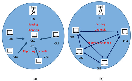 Cooperative spectrum sensing (CSS): (a) centralised; and (b) distributed.