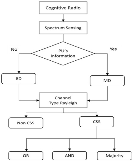 Figure 3 presents a proposed hybrid detector (HD) for CRN spectrum sensing. CR analyses the spectrum of licensed users (or PU): if the PU information is available, then select MD; otherwise, select the ED algorithm. Further Rayleigh fading channel is used to implement both detectors. Both the MD and ED detectors are analysed under non-cooperative spectrum sensing (non-CSS) and cooperative spectrum sensing (CSS). Since it is also based on the demand of the user, a hybrid model can choose either MD or ED as per the complexity of the algorithm. Under CSS, there are again fusion centres for selecting OR, AND, or Majority as per the probability of the required detection criteria.