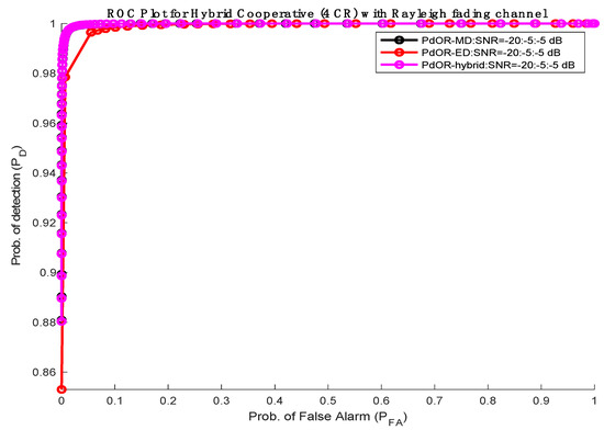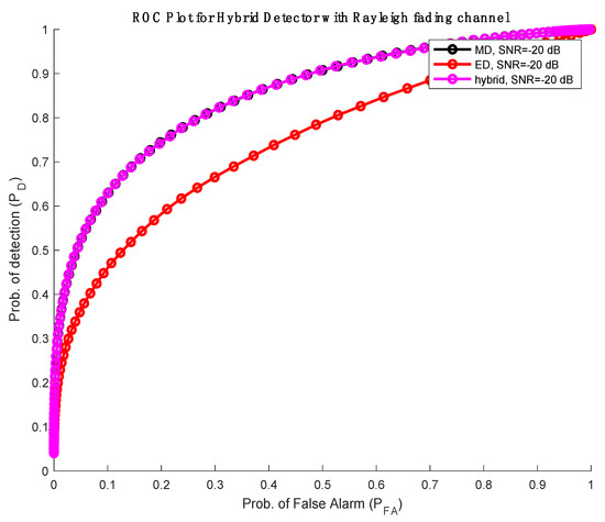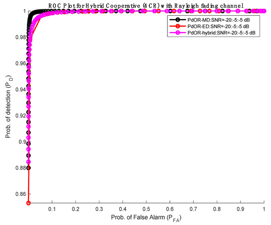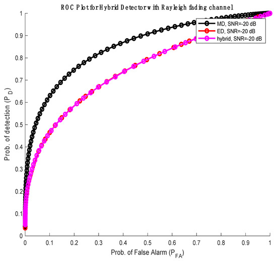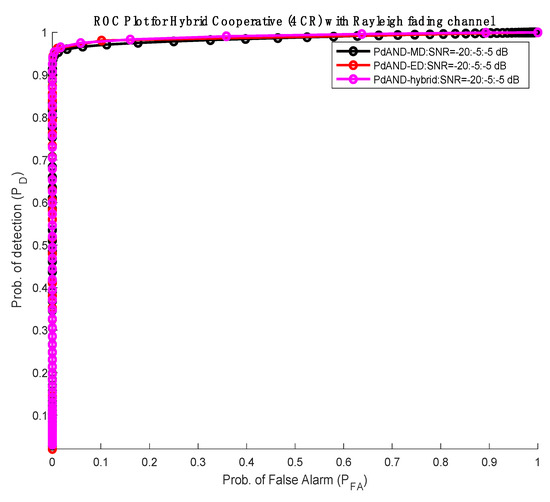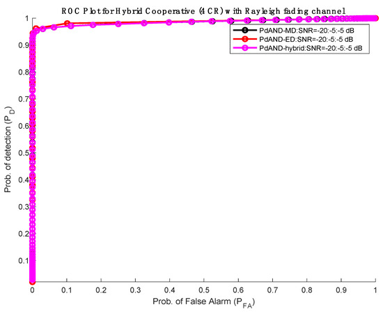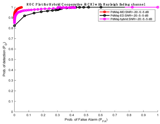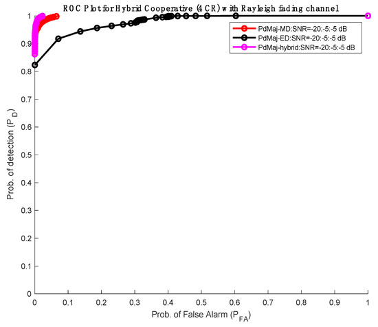 Figure 9, Figure 10 and Figure 11 represent the hybrid detector performance for case 2 with OR, AND, and Majority rule under cooperative spectrum sensing with four CR users. Case 2 reflects the case in which the variable Z is below 0.7 (i.e., 0–0.69), and thus HD selects MD. HD is also theoretically and practically analysed under the worst SNR range from −20 dB to −5 dB for heterogeneous networks. When HD selects MD for case 2: PD is 1 and PFA is 0 using OR rule, PD is 0.96 and PFA is 0 using AND rule, and PD is 0.88 and PFA is 0 using Majority rule. There are four CR users present in CSS for both case 1 and case 2. Below Table 3, a summary of the results of case 1 and case 2 scenarios is shown in Section 5.2.
