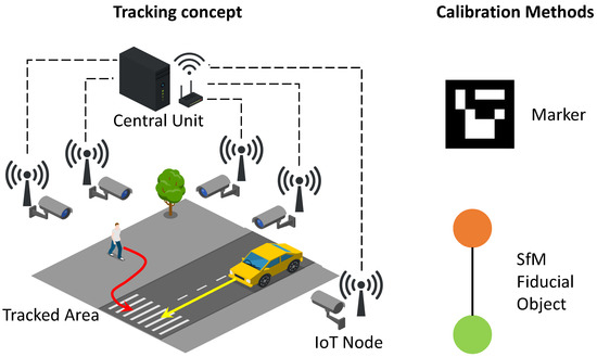To the authors’ knowledge, there has been no comparison of these different camera calibration approaches in the literature thus far, specifically when applied to large outdoor environments in which a distributed system of camera nodes is necessary for 3D tracking. Hence, the proposed work presents a novel network of IoT camera nodes and compares the performance of two approaches for automatically estimating their poses in both indoor and outdoor environments. The first approach follows the SfM pipeline, while the other is marker-based. To this end, a network of synchronized camera nodes was designed and implemented. In addition, a fiducial object was designed for the proposed calibration algorithm based on SfM. Figure 1 shows the proposed concept along with the two calibration methods used for comparison. The performance assessment was based on an indoor experiment and an outdoor experiment in a large environment. The indoor experiment was conducted to assess the performance of the two methods with ground truth measurements, employing a commercial tracking system of millimetric precision. Outdoor experiments directly compared the two approaches on a larger setup with uncontrolled illumination. The results show that the proposed SfM pipeline more accurately estimates the pose of the cameras. In addition, the same methods were used for a tracking application in the indoor setup to show a practical use case. The main contributions of this work are as follows: