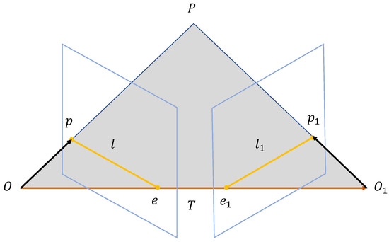 Referring to Figure 2, a 3D point P is projected into two image planes located at different positions, resulting in the projected point image coordinates and . Using a calibrated camera and undistorted images, normalized coordinates that are independent of the camera model can be used. It is necessary to project back the image points into a unit sphere (for omnidirectional cameras) or into the projection frustum (for perspective cameras) in order to obtain normalized coordinates.