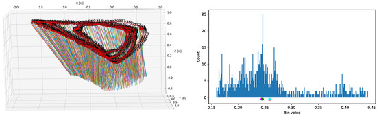 As already discussed, the estimation of the cameras’ poses can be obtained by computing the relative transformations among the cameras and defining a common frame of reference. The proposed approach computes the fundamental matrix for each pair of cameras using the RANSAC algorithm, which allows for discarding the wrong feature matches and offers the possibility of choosing a desired maximum reprojection error for the estimation. The latter aspect can play a crucial role, as the images can be noisy, the quality of the camera optics may not be high, and approximation of the pinhole could introduce possible errors during the projection calculations. Then, the essential matrix is computed from the fundamental matrix and the relative camera pose candidates are generated via SVD decomposition. As mentioned above, while four solutions exist, only one, i.e., the one that allows points to be reprojected in front of both cameras, is correct. In our implementation, feature points in the 3D space were obtained via triangulation, and the solution that projected all of the points in a positive depth space (z-coordinate of the first camera reference frame) was selected as the correct one. At this point, the transformation is correct up to a scale factor. The proposed implementation can rely on the fact that the distance between the features belongs to a wand 88 cm long in the indoor setup and 115 cm long in the outdoor setup. Therefore, the scale factor can be computed by dividing the exact measurement by the mean, median, or mode of all the computed distances of the detected features. These three statistical measures are usually not very different from each other in practice. However, it could be possible that the distribution of the computed distances is not Gaussian due to external noise. By computing a histogram of the obtained distances, as shown in Figure 3, a peak is found at a certain value, suggesting that the mode could better approximate the correct measure. As an example, Figure 3 shows two parts of this pipeline: the reconstruction of reprojected wand trajectories and the selectable metrics for estimation of the wand length in the distance histogram.