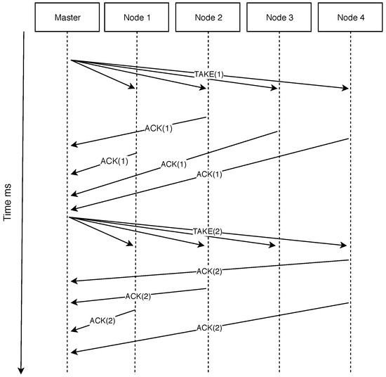 - The master waits for the ACK message to be received from each node, then it broadcasts a TAKE(i+1) message;
