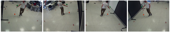 The proposed approach exploits a custom wand for the calibration procedure allowing complete control over the selection of feature points. Even for this method, it is important to select the size of the wand in accordance with the target environmental scenario in order to guarantee fair vision for all the cameras. The wand was realized by placing two colored balls (green and orange, with a 6 cm radius in the indoor setup and a 12.5 cm radius in the outdoor setup) at the extremities of two staffs 100 cm long and 140 cm long, respectively. A software package was responsible for finding the balls and estimating their centers. The detection of the balls occurred on the basis of their colors, which were selected in order to be relatively easy to identify in the outdoor scenario. In particular, the detection algorithm worked as follows: the camera image was converted in Hue Saturation Value (HSV) color space in such a way that the light changes typical of outdoor imaging did not affect the balls’ color descriptions. Then, masks in the specific color range for the selected green and orange colors were employed to filter the image and find the circular blobs, and the largest blob with a radius considered to be feasible was selected as the correct candidate. Finally, the center of the chosen blob was computed from principal image moments as follows: