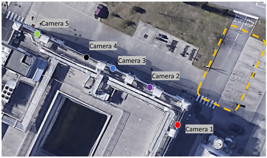 Aerial view of the outdoor scenario and setup of the cameras. An orange line encircles the capture space, while theoretical camera node positions are shown over the roof edge.