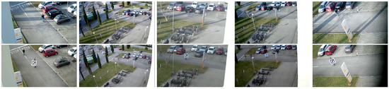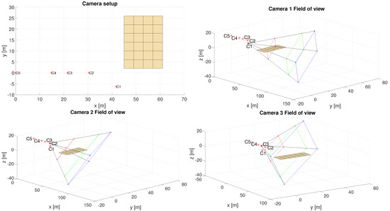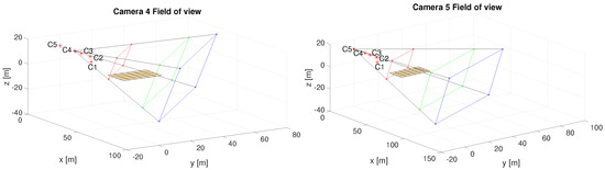 The outdoor setup involved five cameras placed over the roof of a tall building (nearly 11 m high) and pointing down to the area close to the building entrance. Figure 7 shows the theoretical geometric setup. This setup was chosen to stress the capability of the proposed approach in coping with a strict field of view and collinear camera setups, which usually cause issues in the calibration step. Figure 8 depicts examples of frames captured by the cameras during the calibration steps involving both the Aruco Marker and the wand. As mentioned before, for the outdoor scenario the radius of the wand spheres and the size of the marker were increased in order to improve the visibility of the features, considering the greater distance from the cameras. In particular, the Aruco markers were printed on a rigid carton plate with a side of 800 mm, and the wand length was increased to 140 cm with a ball diameter of 25 cm. Low-cost (up to 10 $ each) camera lenses were selected to guarantee sufficient coverage of the area and a minimum density of 60 ppm in the covered area. Figure 9 shows the frustum and pixel density for each camera in the outdoor setup.