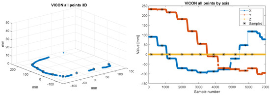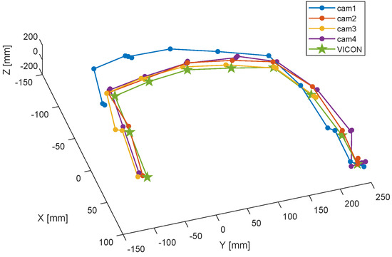 In this section, the comparison between a trajectory reconstructed through the cameras and the VICON system is discussed. The ground truth trajectory is depicted in Figure 10 along with the sampled points acquired by the system of cameras. Each black point in the figure represents the ground truth position of the center of the marker for and estimations, where t is the time index. Figure 11 shows the reconstruction of the marker trajectory by assuming to know the transformation between the Aruco reference frame and VICON for the first detected point.
