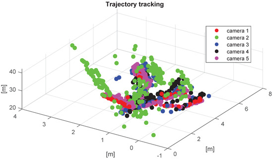 To estimate the cameras’ poses in the outdoor scenario, a capture of 500 frames each was acquired. The synchronized images depicting the wand motion in a small portion of the outdoor environment that was visible from all the cameras’ view frustums were then used to compute a pose estimation through the SfM approach. On the contrary, only a single captured frame for each camera was necessary for marker-based estimation. Additionally, the marker was moved on a tridimensional trajectory within the outdoor environment to capture the motion trajectory. This trajectory was used to verify the capability of the marker-based approach to reconstructing coherent tracking motions from multiple cameras. The results depicted in Figure 12 show that the SfM approach provides a better estimation concerning the camera poses in the environment. Wrong pose estimations could depend on the different camera lenses used (see Table 3), which probably did not correctly fit on the pinhole model, and certainly on depend on the resolution and clarity of the marker image as perceived from a long distance. In the SfM case, this computational error is mitigated by triangulation and optimization being carried out on several frames. However, referring to Figure 13, even if the estimation of the marker-based approach is not accurate, the resulting tracking motion captured from different cameras has a bounded reconstruction error; thus, considering the knowledge of the environment under surveillance, the error in the height estimation can be reduced using a projection on the plane of motion.