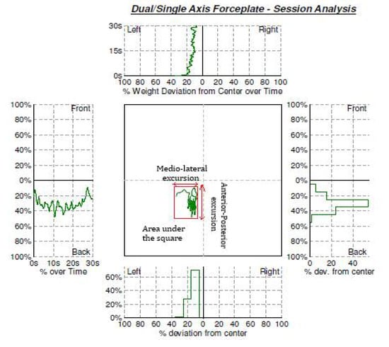 A force platform, also known as a force plate, is a device that is used to assess dynamic and static posture control and associated gait parameters [4]. There are two types of force platforms: (1) with monoaxial load cells that detect the vertical component of the ground reaction force (FZ), and (2) with load cells that detect the three components of the ground reaction force (FX, FY and FZ) along with the moment of force acting on the multiaxial plates (MX, MY and MZ). Uni- and multiaxial plates can be used to assess the anterior-posterior (AP) and medio-lateral (ML) time series of the centre of pressure (which is a point of application of vertical ground reaction force) over time during a postural test. The Centre of Pressure (COP) is the most commonly used parameter for evaluating postural function. Variations in Centre of Mass (COM) displacements are referred to as body sway, whereas changes in COP position are often referred to as postural sway [5].