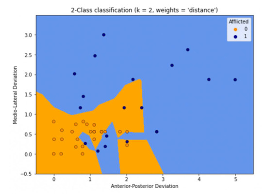 The blue area in Figure 6 indicates what would be predicted as non-afflicted by the machine, and the orange area would be predicted as afflicted.