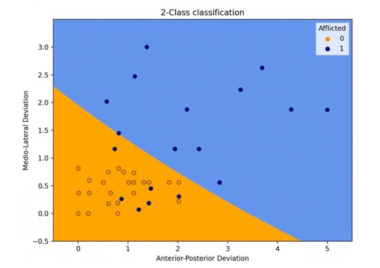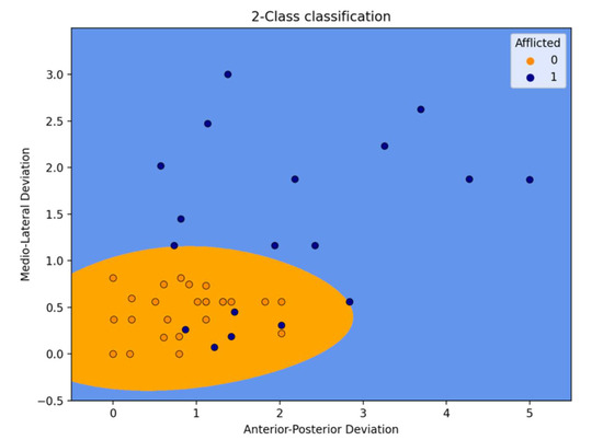 Further, the data were augmented by ten non-afflicted points by randomly selecting AP and ML deviations of two unique, non-afflicted subjects. Six outliers were removed from the data to improve accuracy (Figure 3). The data were normalized using maximum–minimum scaling, i.e., the minimum value of a feature was subtracted from that feature of every data point, and the result was divided by the difference between the maximum and minimum values within that feature.