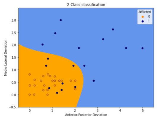 The blue area in Figure 5 indicates what would be predicted as non-afflicted by the machine, and the orange area would be predicted as afflicted.