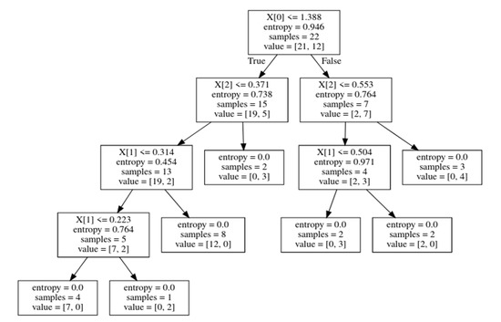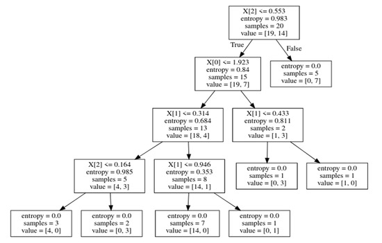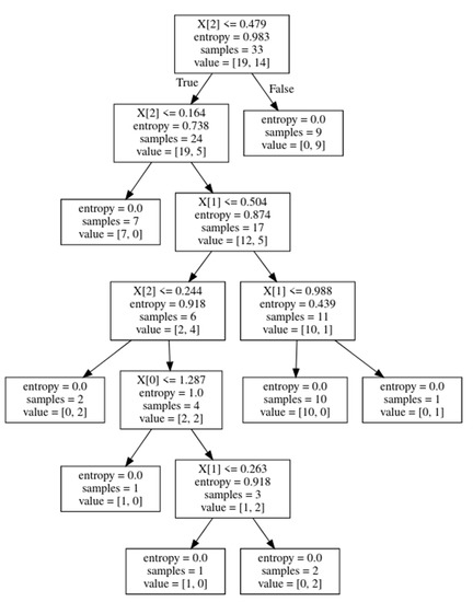The Decision Tree with entropy values, where X [0] is AP, X [1] is ML, and X [2] is area under the square.
