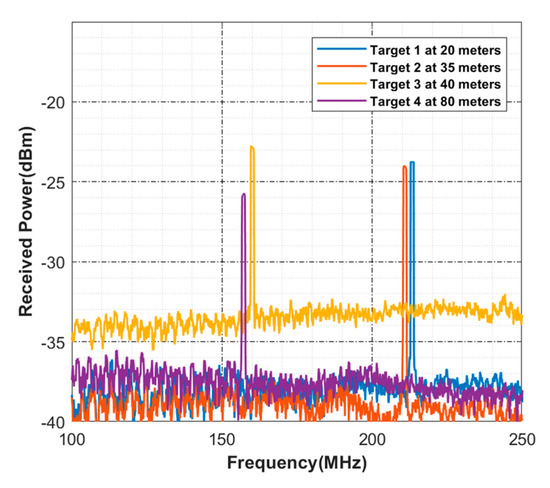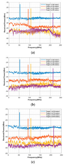 For Target 2, the peak is detected at 92.90 MHz with 21 dBm threshold power whereas for Target 3, it is detected at 106 MHz with 20 dBm threshold power and 213 MHz with 23 dBm threshold power for Target 4. This also satisfies Equation (1). Hence, the reported detection peak from the numerical simulation meets with the criteria of mathematical derivation. When the atmospheric conditions relatively change to fog, the threshold power of the detected peaks reduces accordingly. Figure 3 shows the computed spectrums for the four targets under the atmospheric impact of low, medium, and thick fog conditions.