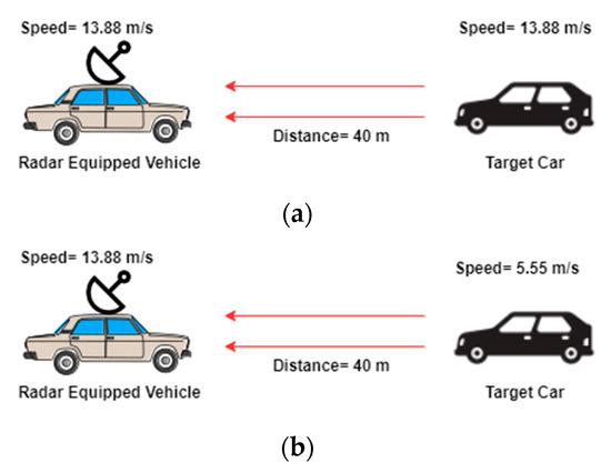 The effectiveness of the proposed photonic radar sensor is established by designing conventional FMCW radar which is the extension of this work. Figure 6 shows the two scenarios of a car which has a mounted conventional FMCW radar. The speed of FMCW radar-equipped car is assumed to be 50 km/h (13.88 m/s). The distance between the FMCW radar-equipped car and target car is considered to be 40 m. In the first scenario, the target car is assumed to be moving toward the radar-equipped car at a speed of 50 km/h (same as with the radar-equipped car). In this case, the relative velocity is calculated as 0 m/s. In the second scenario, the target car is assumed to be moving at a speed of 5.55 m/s toward the radar-equipped car, hence the relative velocity is calculated as 8.33 m/s.