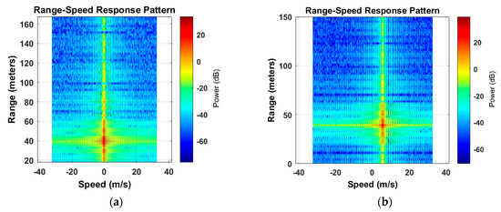 The computed radar pattern response is presented in Figure 7. In the case of Scenario 1, since both the radar-equipped vehicle and target vehicle are moving at the same speed, the velocity of the target vehicle is detected as 0 m/s at the distance of 40 m. The threshold power of the detected target is computed as 60 dB. In Scenario 2, the target vehicle is moving at the speed of 5.55 m/s with its relative velocity of 8.33 m/s at the distance of 40 m. The threshold power in this case is measured as 40 dB. This indicates that the proposed photonic radar sensor has higher threshold power of detected targets with longer distances as compared to microwave radars.