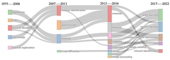 The thematic development path in the field of intelligent mineral identification is shown in Figure 2. In the figure, we can observe the thematic development and the thematic evolution in different periods clearly. Based on the retrieval information available to us, Pooley et al. first proposed that pure mineral powders of known chemical composition could be used as standards to calibrate detection equipment, and the calibration results could be used to obtain the chemical composition of unknown particles for the identification of unknown minerals. As a possible pioneer of intelligent mineral identification, Pooley et al. [56] attracted the research interest of the academic community, but the number of research literature on mineral identification was only 10% (21 papers) of the total literature records as of 2006. Basic mineral identification was studied before 2006, including the works on more efficient algorithms for mineral identification, with a main focus on the color characteristics of minerals [57] and related research aimed at more efficient mineral exploration of unknown rocks [58]. Since 2007, more attention has been paid to the use of spectroscopic information obtained by X-ray diffraction [59,60] for precise mineral identification. After 2012, academic research attempted to use mineral image processing [61] and hyperspectral remote sensing [62] for mineral identification, and focused more on the textures [63] of minerals. At this stage, mineral types such as calcite and feldspar [64] were given major attention because their samples are easy to collect and their datasets are rich and reliable for further research. From 2017 to the present, intelligent mineral identification based on deep learning has become a major direction in academic research, and different ways of mineral identification such as remote sensing and scanning electron microscopy [65] have been actively explored, while more ore types are targeted for mineral identification.