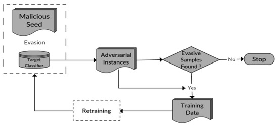 - Evasion attacks: They are the most prevalent type of attacks that may be encountered during system operation. This attack happened during the learned model, e.g., in our case, the attacker changes some words in the URL and it seems readable, but actually, the system fails to classify the result in the classification process of the ML.