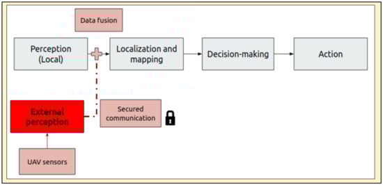 Figure 2 is an improvement of Figure 1. As shown, a UAV (unmanned aerial vehicle), also known as drone, is used as an extra tool to improve driving environment perception. The UAV sensors provide an external perception, happening in parallel with the local perception of the vehicle. The gathered data are transmitted through a secured communication channel. All the information is then stored in a knowledge base, from where it will be managed and processed.