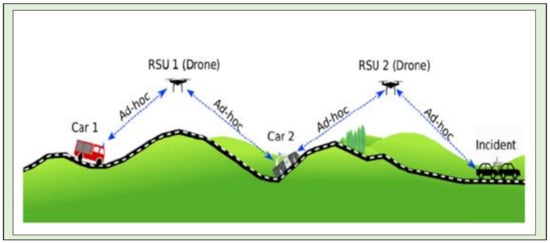 V2X communication is sometimes referred to as VANET (vehicular ad hoc network), the vehicular application of MANET (mobile ad-hoc network). MANETs are described as being “a continuously self-configuring, infrastructure-less network of mobile devices connected wirelessly”, meaning that there is no router in the network and the nodes are used for routing instead, despite being in motion and connected to different nodes over time. In the case of VANETs, the nodes of the network are mostly vehicles, but they can also be other infrastructures, such as RSU (roadside unit) or even pedestrians. Studies have already been made focusing on the use of UAVs as the network’s nodes. In their review of the applications of UAVs in smart cities, Menour et al. [28] introduced the idea of UAVs being part of a larger network. They proposed a deployment method based on the CDS (connected dominating set) graph theory algorithm, which ensures that all nodes of the same area are always connected by constraining the movements of the UAV (i.e., a UAV that goes too far might break connection with its closest nodes). They could be used as hotspots that can be used for monitoring traffic and for routing information in the network (see Figure 4).