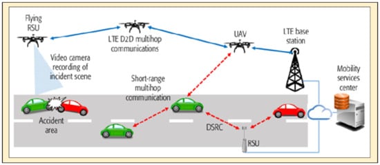 Illustration of UAV/vehicle interactions. Reprinted/adapted with permission from Ref. [28]. 2017, Menouar, H.