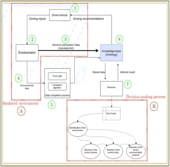 Various data of different nature are generated during the driving process; some can be elements related to the ego vehicle, and some are gathered from the vehicle’s exteroceptive sensors (e.g., brightness or distance to obstacle). These data may come from the vehicle or from an intelligent agent, such as a drone. These data are stored in an ontology, where they are classified in order to formally represent the environment. This approach offers multiple benefits: