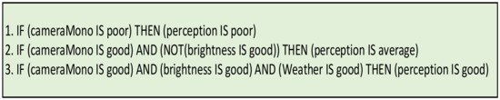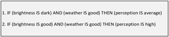 The membership functions of fuzzy logic allow for the transposition of fuzzy expressions into numerical and exploitable values. Once quantified, the inference and defuzzification processes can happen. In the context of this work, we are interested in the evaluation of the capability to perceive the environment, meaning that Perception will be quantified into the following values: Poor, Average and Good. Logical rules will combine values of different variables to infer a general perception value. The rules are in the form of logical IF-THEN structure, making it easy to combine different variables (see Figure 6). In the first case, the brightness is poor, but the weather is great, making the general perception Average. In the second case, both brightness and weather are good, making the perception assessment Good. This approach can also be applied to sensors. Examples are shown in Figure 7.