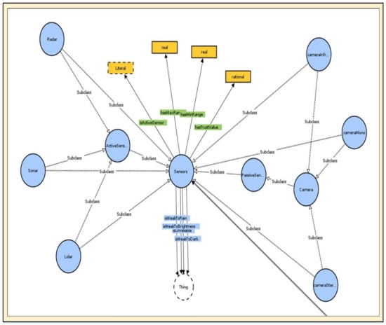 The Stanford 101 Guide defines ontology [36] as “a formal explicit description of concepts in a domain of discourse, properties of each concept describing various features and attributes of the concept, and restrictions on slots”. An ontology basically defines the main actors within a domain of discourses and the different interactions and relationships between them [37]. Ontology [38,39,40] may be represented by: