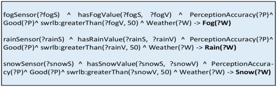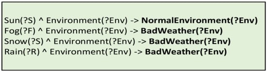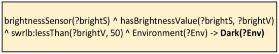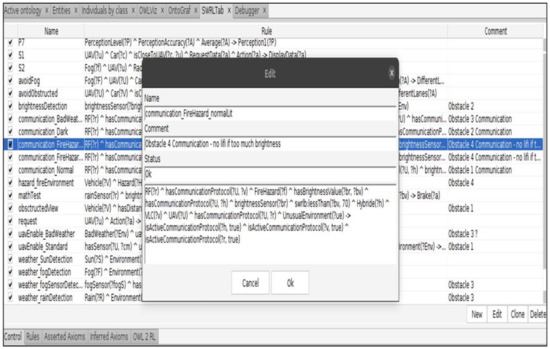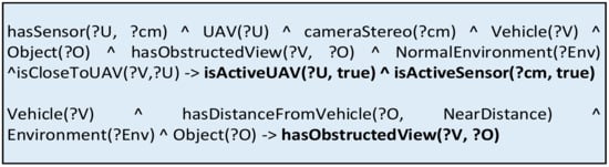 There are multiple ways to implement rules into a knowledge base. This work uses the SWRL (Semantic Web Rule Language) approach [45,46,47]. As stated, it is a language of logic description that enables the combination of different rules to build a more complex axiom. The official documentation gives the following basic example to define the syntax: has Parent(? × 1, ? × 2) ˆ has Brother(? × 2, ? × 3) -> has Uncle(? × 1, ? × 3). Here, we are using SWRL notation. The symbol ? means an instance of a class. For example, the axiom Vehicle(?v) means that v is an instance or an individual of the class Vehicle. The has Parent(? × 1, ? × 2) is a property related to two objects. It means object ×1 has a parent which is object ×2. The symbol ∧ means logical AND operator, while -> means a conclusion, a result, or a post-condition. Hence, in the example, by joining the two axioms has Parent and has Brother, it is possible to apply the has Uncle relation to the individuals, hence making the individual ×1 the child of ×2 and the nephew of ×3.
