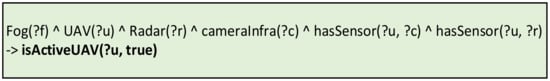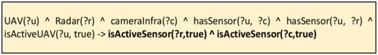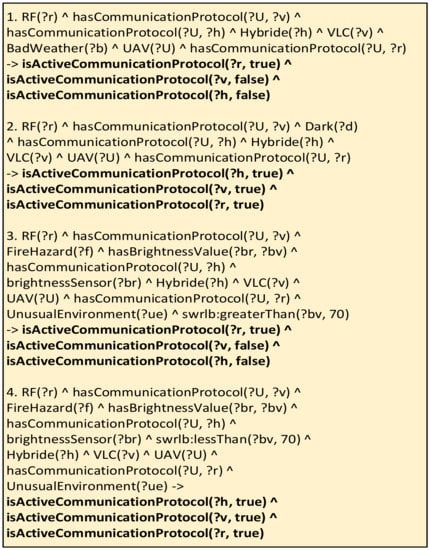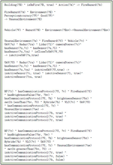 The logical rules related to handling the fire hazard situation in the use case scenario are shown in Figure 28. First, the given scenario states that there is a building, and it is on fire. The second rule concludes that the area belongs to the UnusualEnvironment category. Next, another rule validates that it is an unusual environment. Given the case, it finds a UAV in the environment that has three sensors: radar, lidar, and stereo camera. This UAV is activated. The next rule activates all the three sensors. Due to the ongoing fire, the system gets the brightness value in the environment. Two rules decide which communication protocols would be activated. The first one states that if the brightness value is lesser than the threshold value, then the three communication protocols available in the UAV are all activated, namely RF, VLC, and hybrid. The second rule is applicable if the threshold value of brightness is exceeded. If so, then only the RF communication protocol is activated given that it is the one that is appropriate for the situation. The other two protocols—VLC and hybrid—are deactivated.