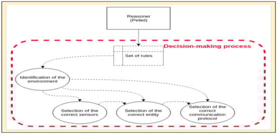 - These collective processes form the decision-making process of the system. As shown, to decide accordingly, the reasoner consults various sets of rules related to the identification of the environment, the selection of correct sensors, the selection of correct entity or UAVs that possess the correct sensors, and the selection of the correct communication protocol.