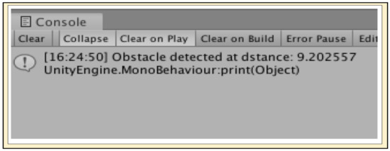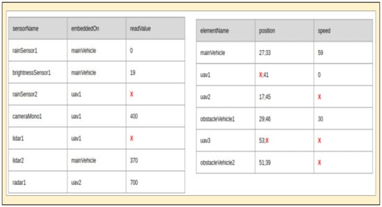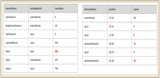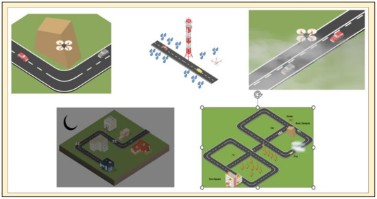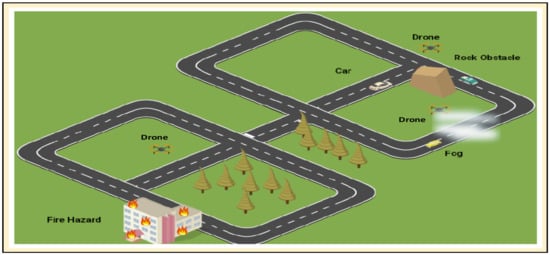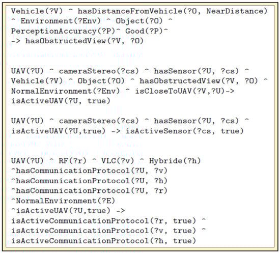 As shown in the logical rules stated in Figure 26, there is a huge rock obstacle near the intersection of two roads, ahead of the ego vehicle. Given that the perception accuracy value in the environment is good, the huge object is considered an obstacle to the vehicle; hence, this case is considered as “obstructed view”. Next, there is a UAV containing a stereo camera in the given situation. Such a UAV is near the ego vehicle; it is the one needed and so this UAV is activated. The stereo camera within the UAV is also activated. Finally, the environment is considered normal; hence, all the possible communication protocols (RF, VLC, and hybrid) are activated.