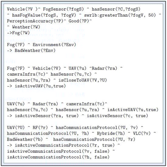 The logical rules related to handling a foggy road situation are shown in Figure 27. As shown, the environment sensor detects a fog value greater than the threshold value. As such, it concludes that the concerned area is a foggy one, and on a foggy environment, the BadEnvironment flag is set to ON. Meanwhile, there is a UAV nearby, near to the ego vehicle. This UAV is equipped with two sensors: radar and infrared camera, the ones needed for a foggy weather condition. The next two rules activate the UAV as well as the radar and infrared camera. Next, the UAV possesses RF, VLC, and hybrid communication protocols. Given the weather condition, the appropriate logical rule activates the RF communication protocol, while deactivating those of the VLC and hybrid.