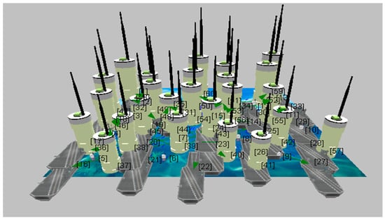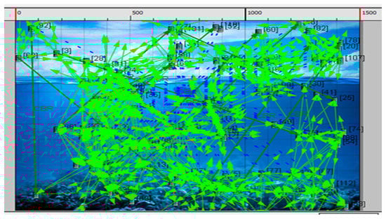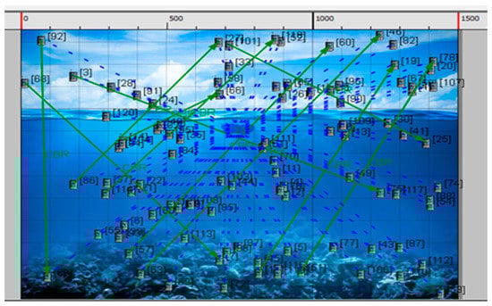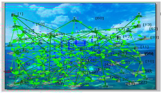 Considering the constant bit rate (CBR) as a deployment application, there are accessible existing networks available. In the proposed network, file transfer protocol (FTP) and variable bitrate (VBR) are considered alongside CBR, and the parameters for all three FTP, CBR, and VBR applications are then compared [35,36]. The proposed scenario has a 1500 × 1500 square meter design in the Qualnet 7.1 Simulator. The FTP, CBR, and VBR applications are connected between 60 and 120 nodes, of which 15 are node devices, 25 are ship devices, 20 are sensor devices for 60 nodes, 30 are node devices, 50 are ship devices and 40 are sensor devices. The simulation lasts for 500 s in total. Random waypoint mobility with a minimum speed of 1.5 m/s and a maximum speed from 3 to 10 m/s is the node mobility model that has been selected. Beyond AODV, the other considered routing protocols are DSR, DYMO, LAR1, Bellman-Ford, OLSR, Fisheye, STAR-ORA, ZRP, and STAR-LORA. After finishing the test, the graphs in the simulator were considered. The required performance metrics are thus obtained, including the average transmission delay, average jitter, percentage of utilization, and the energy used in transmit and receive modes. The proposed underwater wireless communication scenario with multiple nodes in X-Y and 3D visualization is shown in Figure 4 and Figure 5 for 60 nodes. Runtime proposed scenario for underwater wireless communication with various nodes in both X-Y and 3D visualization is shown in Figure 6 and Figure 7 for 120 nodes [37,38].