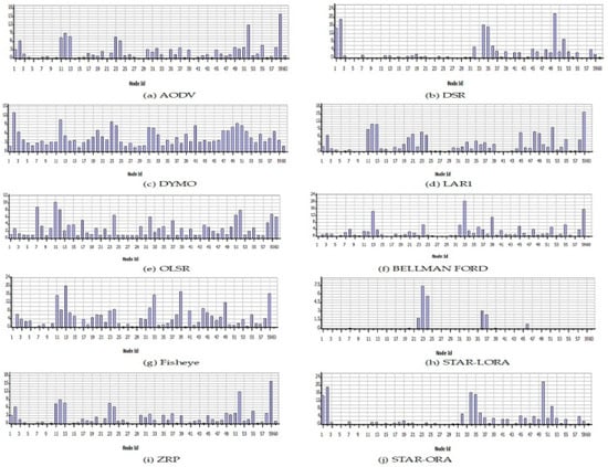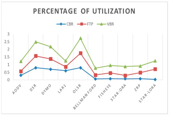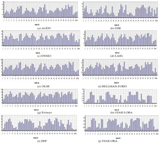 5.4. Percentage of Utilization by AODV, DSR, DYMO, LAR1, Bellman-Ford, OLSR, Fisheye, STAR-ORA, ZRP, and STAR-LORA Routing Protocols