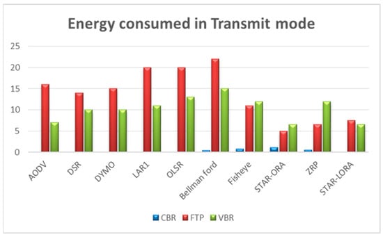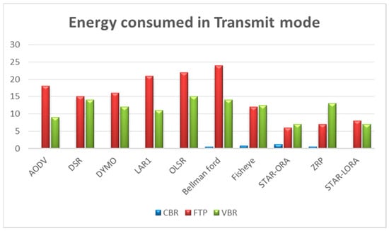 5.1. Energy (mWh) Consumed in Transmit Mode by AODV, DSR, DYMO, LAR1, Bellman-Ford, OLSR, Fisheye, STAR-ORA, ZRP, and STAR-LORA Routing Protocols
