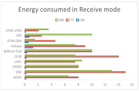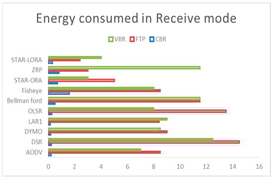 5.2. Energy (mWh) Consumed in Receive Mode by AODV, DSR, DYMO, LAR1, Bellman-Ford, OLSR, Fisheye, STAR-ORA, ZRP and STAR-LORA Routing Protocols