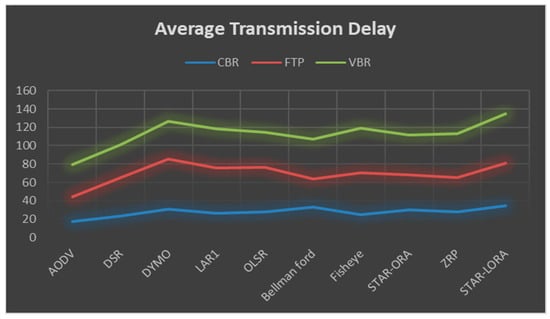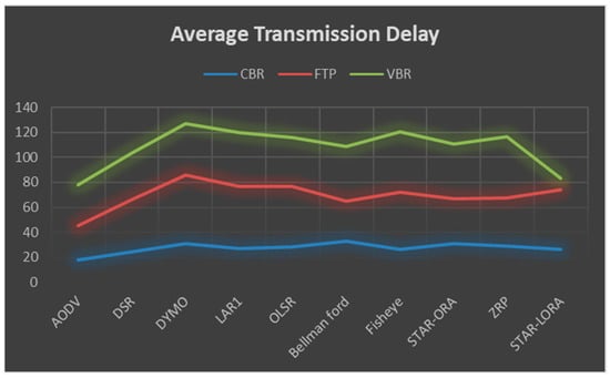 5.3. Average Transmission Delay (µs) by AODV, DSR, DYMO, LAR1, Bellman-Ford, OLSR, Fisheye, STAR-ORA, ZRP and STAR-LORA Routing Protocols