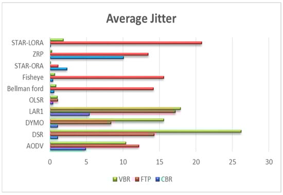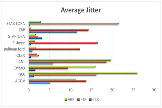 5.5. Average Jitter (µs) by AODV, DSR, DYMO, LAR1, Bellman-Ford, OLSR, Fisheye, STAR-ORA, ZRP, and STAR-LORA Routing Protocols
