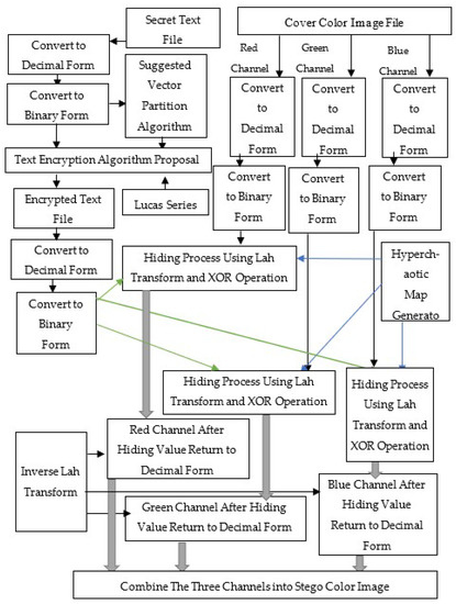 A steganography mechanism enables encrypted secret data to be transmitted. Typically, a digital image comprises disparate visual pieces known as pixels. In this work, the cover image is a colour image. Therefore, each image is represented by three arrays of comparable size, each containing several bytes. This work is dependent on a hybrid technique for concealing encrypted text messages in a colour image that begins with a vector segmentation stage, which provides the binary representation of the text file’s values for many vectors of varying lengths. Before these are integrated, the vectors are independently blended based on the Lucas series, and the resulting bits are then converted to ASCII code and stored in a text file. The concealment of the encrypted text file begins with the production of a random integer of values based on a hyperchaotic map (combined Tent map and Ikeda map). This hyperchaotic map value determines the location in which the text data is to be hidden in a nonsequential manner. The encoded text data are then embedded into the image bits using the Lah transformation and the LSB algorithm. Based on the above, we can see that the proposed strategy relies on the Lah transform, hyperchaotic map, and modified LSB. Text information during network communications is considerably protected when combined with the proposed technique and encryption. The steps given below describe this set of procedures in more detail, and Figure 1 illustrates the proposed steganographic schema diagram.
