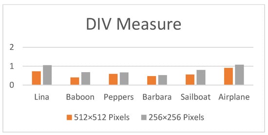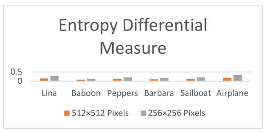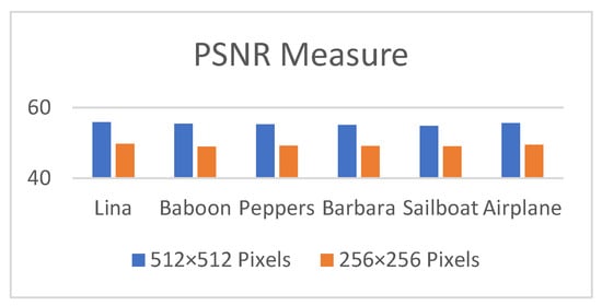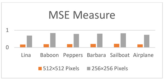 The results of various metrics such as the MSE, NCC, AD, NAE, and SC values obtained for the Lina image in two sizes (256 × 256 and 512 × 512 pixels) with varying sizes of hidden texts (2000, 10,000, and 17,000 bytes) are illustrated in Table 1. According to an analysis of the results, the MSE rate is reduced by the suggested technique, and the PSNR rate is higher. That means that the current approach creates no mistakes in the embedding procedure. Table 2 compares the proposed approach to work in [35] and [39] to determine the value of the suggested system, whereas Figure 4, Figure 5, Figure 6, Figure 7, Figure 8 and Figure 9 provide comparative plots for measures such as PSNR, MSE, SSIM, DIV, bias, and entropy difference. As in Table 4 and Table 5, all entropy categories for the Lina image show that the new technique outperforms the present methods. Table 5 also shows that the Shannon entropy difference value between the cover and stego-images is close to zero, which means no change to the cover image is required to disclose the reality of the hidden data. Furthermore, examining the joint entropy with different hiding ratios for the proposed technique (as given in Table 4) shows that joint entropy significantly changes with different embedded ratios and, as a result, joint entropy is a distinguishing feature of this steganographic technique. This applies to the analysis of mutual and conditional entropies, whereas for relative entropy, the value decreases as the size of the cover image increases while the size of the hidden data remains the same; thus, the closer to zero, the better.